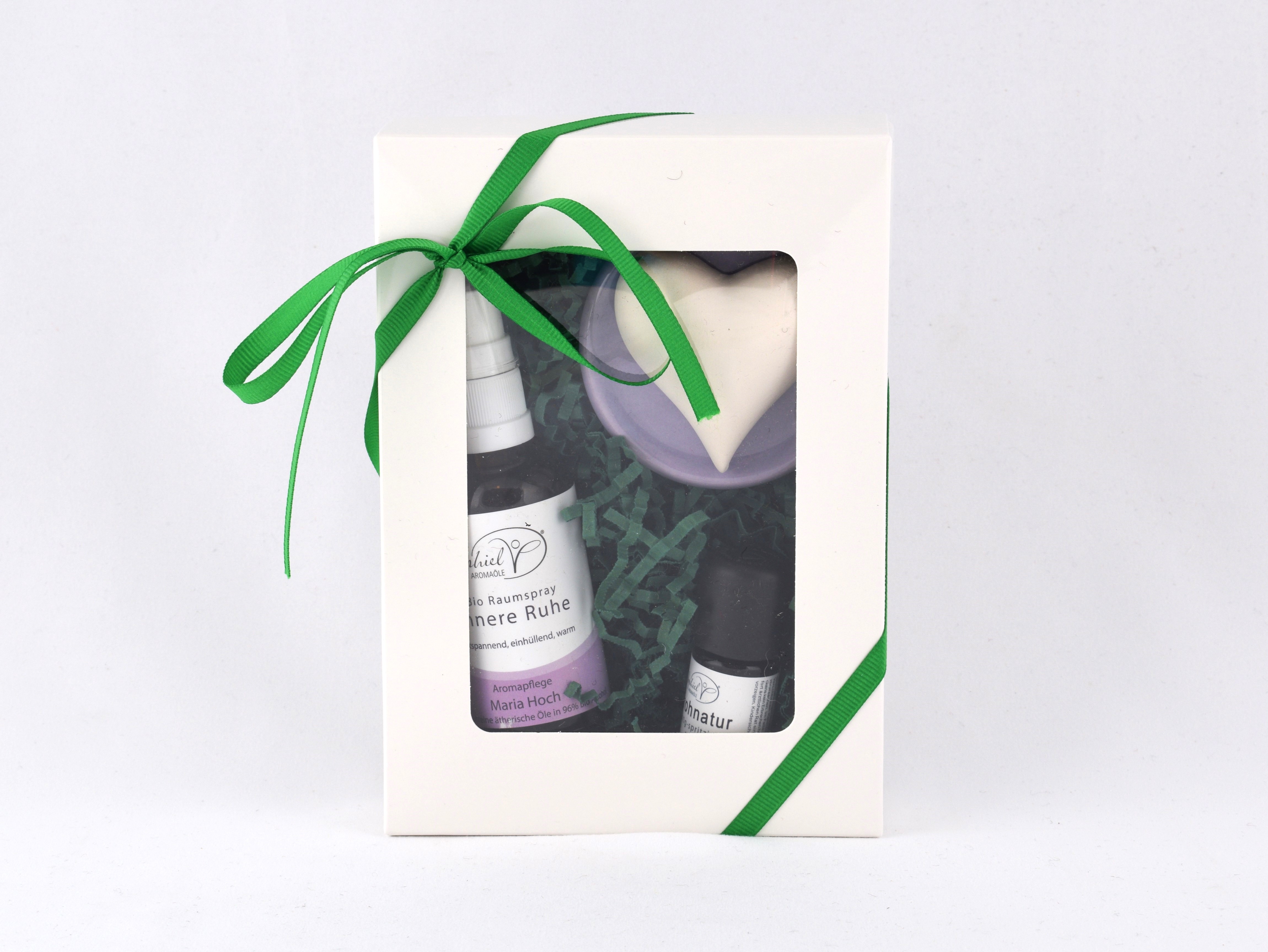 Raumspray "Innere Ruhe" & Duftkomposition "Frohnatur" & Duftstein "Herz" mit einem lila Keramikuntersetzer als Set im attraktiven Geschenkkarton mit Sichtfenster verpackt.