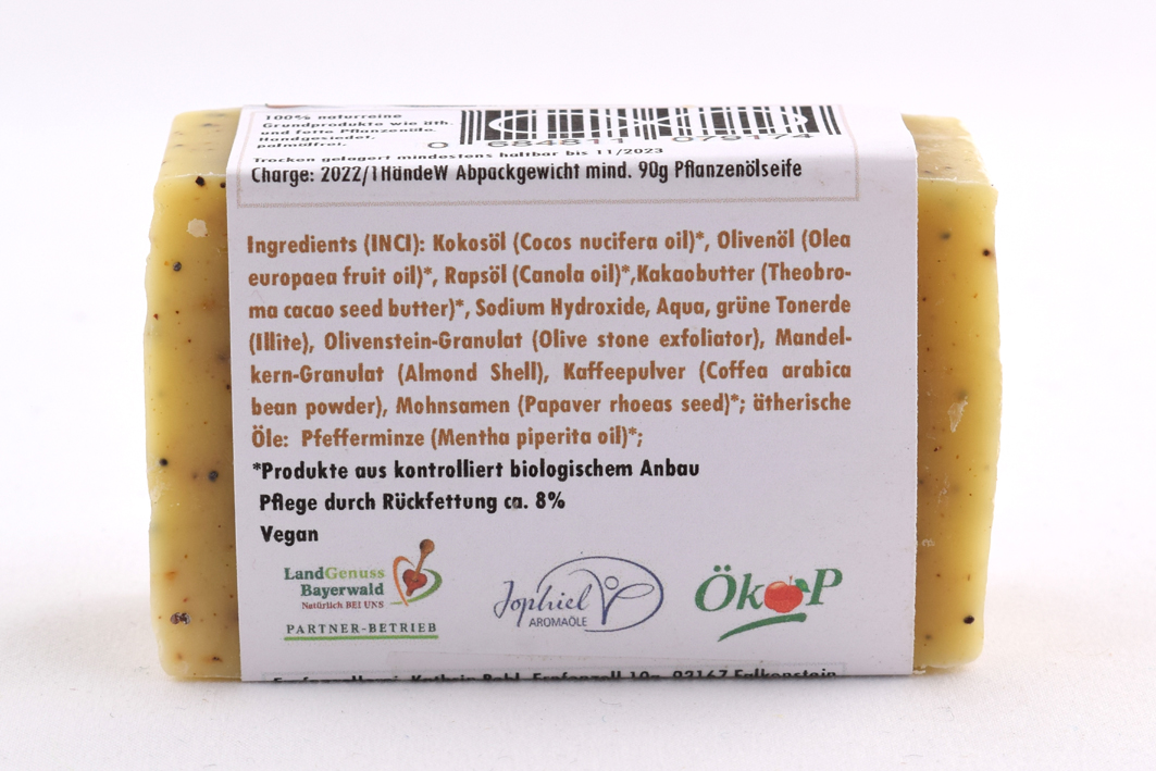 Kaffeepulver, Mandelkernpulver, Olivensteinpulver und Mohnkörner ergeben eine raue Oberfläche, die perfekt zum Schrubben und Peelen stark verschmutzter Hände geeignet ist. Pfefferminzöl ist bekannt für seine desinfizierende, und das darin enthaltene Menthol für seine durchblutungsfördernde Eigenschaft. Als Luxusrückfettungsöl dient Kakaobutter. Die natürliche Farbgebung der Seife bildet Tonerde grün. Vegan.