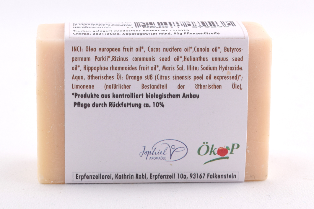 Salzseifen regulieren den Feuchtigkeitshaushalt und hinterlassen eine zarte Haut. Besonders empfindliche Haut reinigt diese Peelingseife mild. Sehr zu empfehlen sind sie zur Gesichtspflege bei unreiner Haut. Verstärkt wird der Effekt durch Sanddornfruchtfleischöl als Vitaminspender und Orangeöl zur Hautpflege. Als Luxusrückfettungsöl dient kostbare Sheabutter. Für eine erhöhte Pflege wurde dem Seifen-Leim gesättigtes Salzwasser zugegeben. Die natürliche Farbgebung der Seife bildet Sanddornfruchtfleischöl gelb. Vegan.