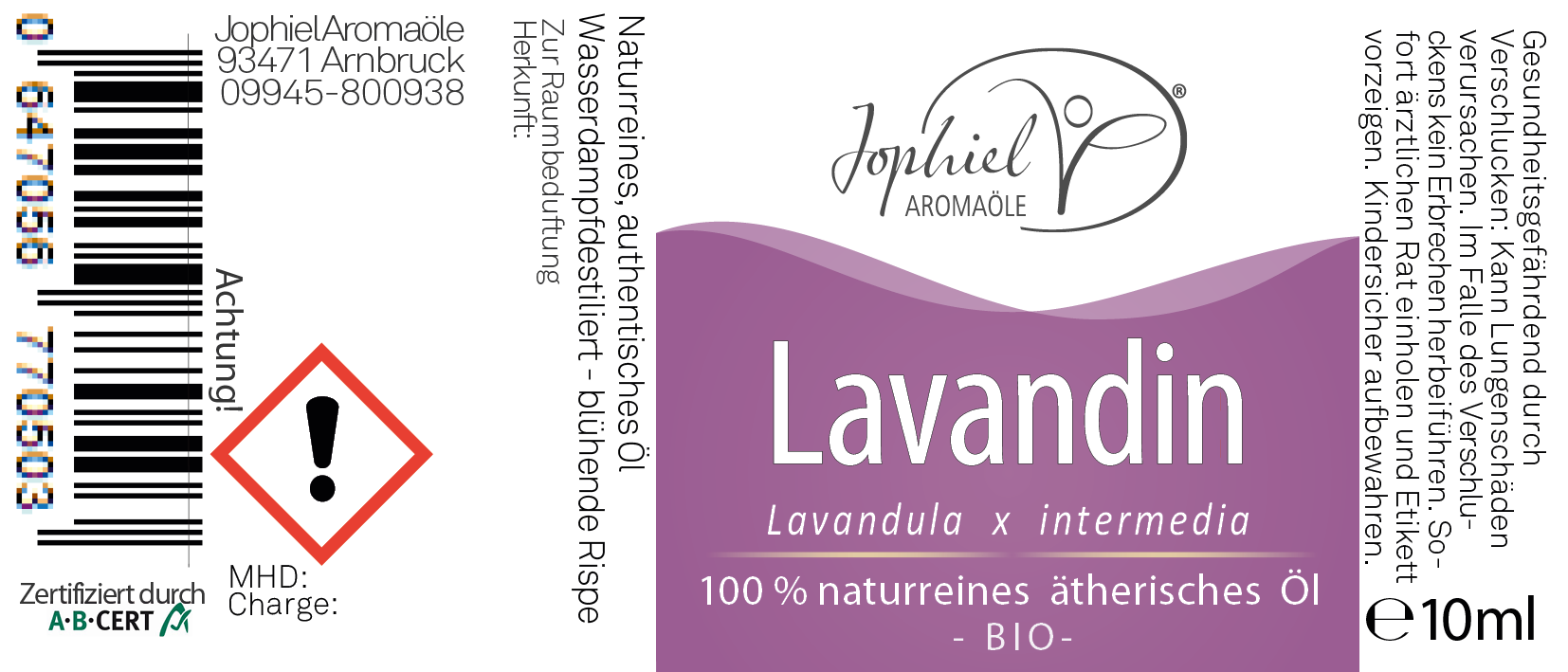Lavendel fein Bio 10 ml"Lavandula angustifolia "100 % naturreines ätherisches ÖlWasserdampfdestillat aus Blüten und Rispen des LavendelsBulgarien, kbADuftrichtung: blumig, süß, mild und klar Bitte beachten:Ätherische Öle dürfen nicht unverdünnt angewendet werden!Sie können - zur Raumluftverbesserung und Raumbeduftung z.B. im Diffuser, Duftstein o.ä.oder im Riechstift angewendet werden.- zum kosmetischen Einsatz, mit fetten, pflanzlichen Basisölen (z.B. Jojoba-/Mandel- / Sesamöl), je nach Rezeptur, stark verdünnen. Bei der Aromatherapie bitte immer die entsprechende Fachliteratur zu Rate ziehen. Mischt sich gut mit: Rose, Rosengeranie, Vanille, Jasmin, Patchouli, Rosmarin, Zeder, Muskatellersalbei, sowie allen Zitrusölen.Wir bieten in unserem Sortiment "Immo-La-Ci" an, eine Notfallmischung aus Immortelle, Lavendel und Cistrose an.Außerdem finden Sie in unserem Sortiment auch das "Lavendel-Hydrolat", das bei der Wasserdampfdestillation aus den Blüten und Rispen des Lavendels gewonnen wird. Produkthinweise und Kennzeichnung: Produktinformationen (GPSR): Lavendel Öl, 10 ml Art. Lan001010 100% naturreines ätherisches Öl zur Verwendung als Raumduft. Kontakt mit Augen, Haut und Schleimhäuten vermeiden. Darf nicht in die Hände von Kindern gelangen. Warnhinweise: GHS07, GHS08Signalwort: GefahrBei Verschlucken und Eindringen in die Atemwege kann es tödlich sein. Kann allergische Hautreaktionen verursachen. Schädlich für Wasserorganismen, mit langfristiger Wirkung. Freisetzung in die Umwelt vermeiden. Bei Verschlucken: Sofort Giftinformationszentrum oder Arzt anrufen. Kein Erbrechen herbeiführen. Bei Kontakt mit der Haut: Mit viel Wasser und eventuell mit Seife waschen. Kontakt mit den Augen: Einige Minuten lang sorgfältig mit Wasser spülen. Kontaktlinsen nach Möglichkeit entfernen. Bei Hautausschlag oder -reizungen: Ärztlichen Rat einholen. Bei anhaltender Augenreizung: Ärztlichen Rat einholen. Hersteller: Jophiel Aromaöle Eckerstr. 32 93471 Arnbruck - DE Tel: 09945-8009938 EMail: info@jophiel-aromaoele.de www.jophiel-aromaoele.de