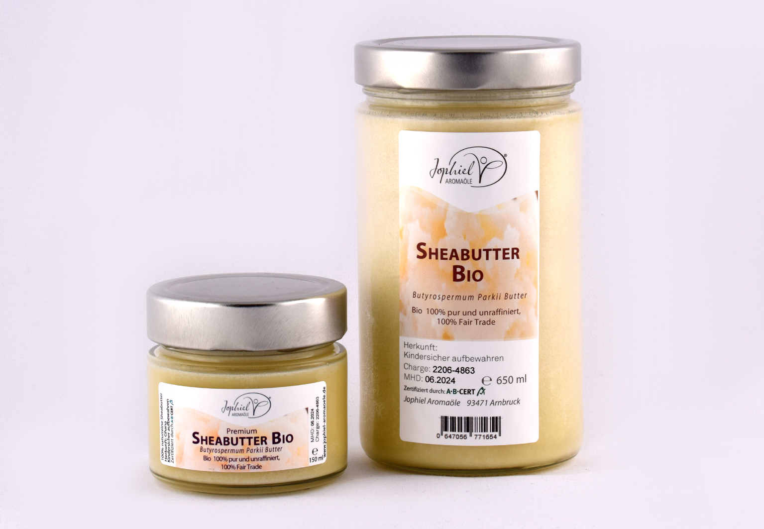 Sheabutter ist in den Produktgrößen 650 ml und 150 ml erhältlich.